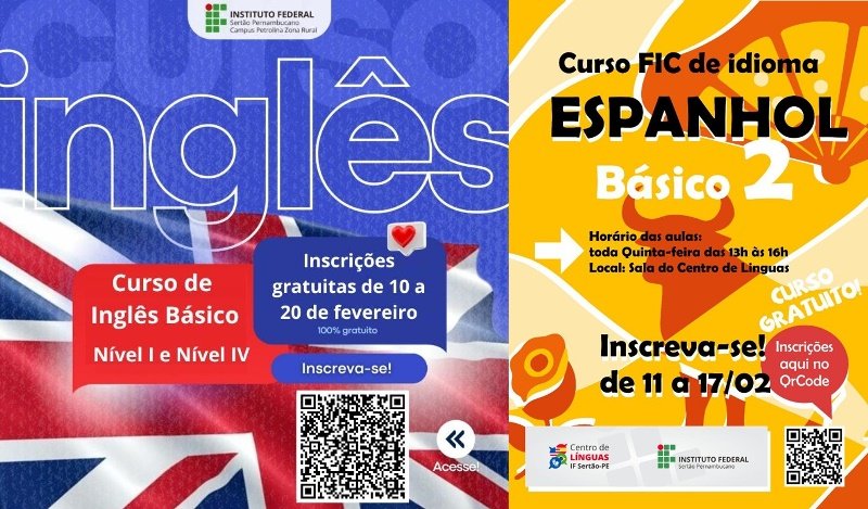 O campus Petrolina Zona Rural do Instituto Federal do Sertão Pernambucano (IFSertãoPE) está com inscrições para os cursos de Formação Inicial e Continuada (FIC) em Inglês Básico Nível I, Inglês Básico Nível IV e Espanhol Básico Nível II.
