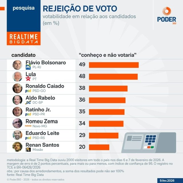 A pesquisa Real Time Big Data divulgada nesta 2ª feira (9.fev.2026) mostra que o senador Flávio Bolsonaro (PL-RJ), pré-candidato ao Planalto, possui a maior porcentagem de rejeição entre outros nomes da corrida presidencial. Dos entrevistados que o conhecem, 49% dizem que não votariam nele.
